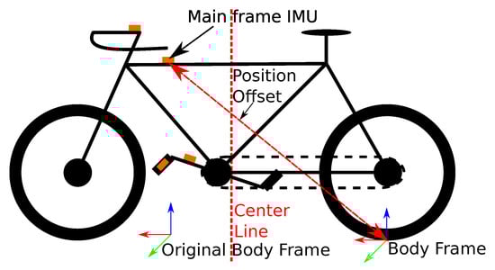 The orientation is modeled as an Euler–Rodriguez rotation matrix. Usually, the acceleration and angular rate are modeled as inputs instead of states. We chose to add them to the state to apply prior knowledge to them. Originally, we defined the point on the ground under the main frame IMU as the body frame (see Figure 2), instead of the IMU pose, because the chosen prior knowledge does not hold for the IMU pose. Taking the bike dynamics into account [], the forward velocity prior does only hold at the center of the rear wheel. At other points, side velocities appear when the bike drives a curve. Thus, we changed the body frame to the position on the ground under the center of the rear wheel.