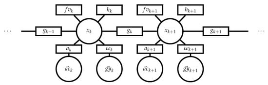 The dynamic model connects the states and over time. The predicted next state has to match the next state . The dynamic model is based on the classic inertial navigation system (INS) state space model (Section 3.7.1 of []):