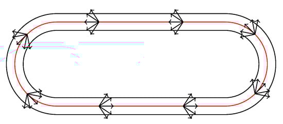 [] Basic form of the track. The red line shows the 1D simplification. The arrows show the possible heading range.