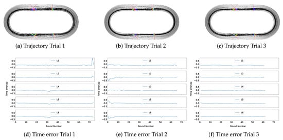 (a–c) Trajectory of a biker in all trials after 100 iterations. The lasers are shown as red lines. Blue color means that the estimator predicts that the bike passes a laser barrier. Red color means that a barrier measured that a bikes passes. Green color shows where prediction and measurement agree. (d–f) Time error between measured pass time and predicted pass time of the laser barriers.
