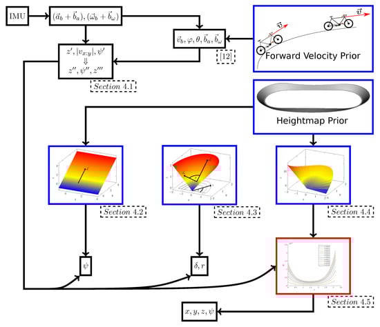 The second prior is the height map prior, which states that the bikes have to stay on the track. Several works use maps to improve the state estimate. The map can have different forms; e.g., route maps [,,] with the paths that can be taken or building plans [] with impassable walls. With a terrain map, a vehicle can be localized without a GNSS []. Similarly, the track of the race (see Figure 1) can be modeled as a height or terrain map. In contrast to the forward velocity prior, the observability with a map prior is unknown.