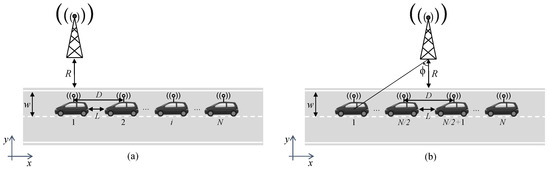 Figure 1a presents a situation where the BS is aligned with the antenna of the platoon leader. Since, in this case, each vehicle is located at a different distance from the BS, it is referred to as the asymmetric case. In Figure 1b, the line connecting the BS with the platoon leader forms an angle with the perpendicular line, so that the BS is aligned with the platoon middle point in the x-axis. This scenario is referred to as symmetric since half of the vehicles are located at the same distance from the BS than the other half.