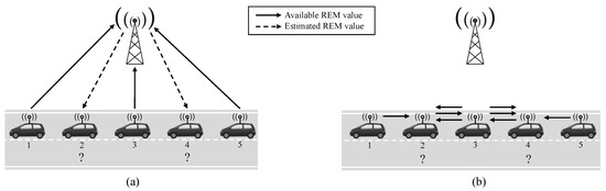 Two different architectures can be contemplated for the purpose of REM reconstruction via OK interpolation, namely, centralized and distributed. Note that this differentiation is aligned with the need to reduce Kriging’s complexity for large sets of samples. In the centralized setting, vehicles with available REM values forward them to the BS for reconstructing through Equation (2) in a centralized manner. In the distributed architecture, the reconstruction in Equation (2) is directly calculated at the remaining vehicles by message passing among the vehicles in the group.
