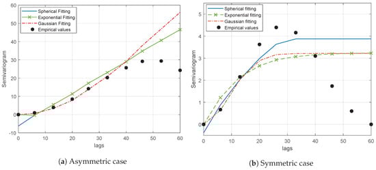 Figure 3a,b represent examples of semivariogram fittings with the spherical, exponential and Gaussian models for the asymmetric and symmetric cases, respectively. As it can be seen, whereas the trend of the empirical values is reasonably well followed by the fitting models in the asymmetric case (Figure 3a), none of the models can obtain a good fitting in the symmetric case (Figure 3b), due to the particular geometry of the scenario under consideration. Although the random variation added by the shadowing contribution will in practice mitigate this effect, the average received power term is given by the path-loss contribution. Thus, for the sake of generality, the fitting is performed considering the average received power as the field value.