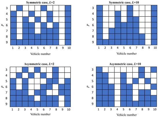 Figure 4 shows the patterns of vehicles’ positions with available REM values that provide the minimum MSE of REM reconstruction for different values of P. The selected vehicle positions are highlighted in blue. Recall that results for the OK in the symmetric scenario were obtained with the spherical model for the semivariogram, whereas the Gaussian model is used in the asymmetric case. It is worth noting that the minimum MSE was also achieved by considering the mirrored patterns. It can be observed that the selected vehicle pattern varied depending on the scenario (symmetric/asymmetric) and inter-vehicle distance value. Comparing first the results in the symmetric scenario, at the top of Figure 4, a clear trend to select the first and last vehicle samples together with an increasing number of additional positions generally located in the central area of the platoon was observed. Furthermore, for in this symmetric scenario, the selected combination for a given P always contained the same vehicles selected for plus an additional one. The latter effect was also observed for , but starting from . Regarding the vehicle patterns for the asymmetric case, at the bottom of the figure, the selected combinations were again included in the majority of cases the first and last vehicles, but did not follow a clear trend for a given P to include the same vehicles selected for plus an additional one.