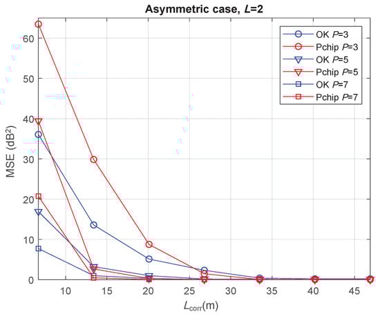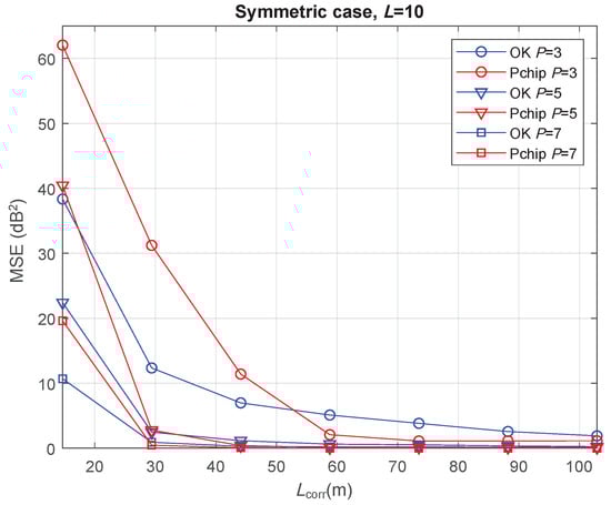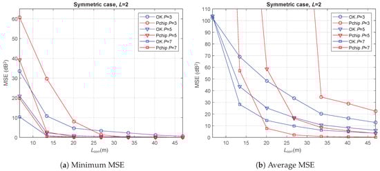 Finally, the asymmetric case is evaluated with . The resulting minimum MSE values are those shown in Figure 7. It is observed that, for a high correlation between the channel samples (), the REM reconstruction was highly accurate, since minimum MSE values went down to zero for every P value in both OK and Pchip. Note that, the MSE curves in the symmetric case for showed small values, remaining above zero in the whole range (see Figure 5a and Figure 6). The slightly worse reconstruction accuracy in the symmetric scenario is then consistent with the semivariogram fitting discussion in Section 3, where the symmetric case experienced a poorer EV fitting due to the particular features presented in that section.