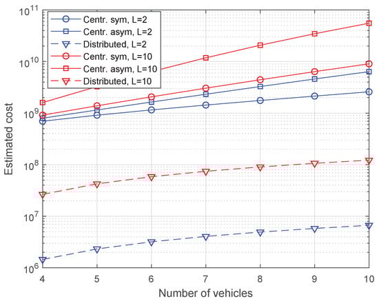 Focusing now on the effect of the inter-vehicle distance (L), the results show that it had a higher impact on the distributed scheme, showing a constant cost gap of more than an order of magnitude for all numbers of vehicles. This result is reasonable, as the distance used for the cost estimation is straightforwardly related to this parameter. It can be further observed that the communication costs of the distributed approach were substantially lower than those calculated for both centralized schemes, despite the fact that the distributed approach exchanged a larger number of messages (e.g., 23 messages for ). This is due to the higher proximity between the communication points, which increases the denominator term in the cost functions. Recall that L does not contribute to the cost of the centralized schemes directly, but combined with a term that includes also the distance from the BS to the road border R (see Equation (7)). Therefore, the contribution of L turns more significant as its magnitude approaches the one of R. The latter effect also justifies that the cost gap between centralized and distributed schemes decreases as L gets higher for a given N.