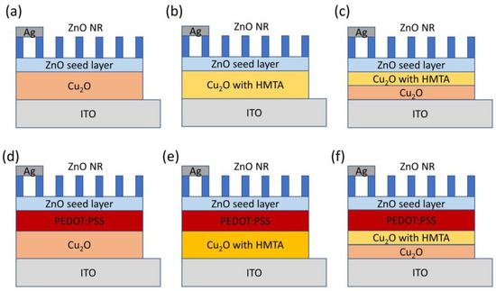 Samples were prepared as follows (Figure 1). ITO glass substrates were sequentially cleaned by acetone, methanol, and deionized water (DI) using an ultrasonic cleaner for 30 min. The substrates were then dried by N2 gas to remove impurities, such as dust and oil, which could contaminate or affect the deposition of the Cu2O film on the electrode surface. The ITO glass substrates were baked at 100 °C to remove any residual solvent. The Cu2O film was deposited on the ITO glass substrates using the electrochemical method [27] in three ways. (1) As shown in Figure 1a,d, the electrolyte was made of 0.4 M CuSO4 and 85% lactic acid. NaOH was added to obtain a 1000 cc electrolyte with a pH of 12. The Cu2O film was deposited at 60 °C and 0.5 V of the electrolyte for 30 min. (2) As shown in Figure 1b,e, the electrolyte was made of 0.4 M CuSO4, 85% lactic acid, and 0.4 M HMTA. NaOH was added to obtain a 1000 cc electrolyte with a pH of 12. The Cu2O film was deposited at 60 °C and 0.5 V of the electrolyte for 30 min. (3) As shown in Figure 1c,f, the Cu2O film was deposited at 60 °C and 0.5 V of the electrolyte prepared by the first and second methods for 25 and 5 min, respectively. PEDOT: PSS was spin-coated on the Cu2O or Cu2O with HMTA film in two steps: (1) 600 rpm for 10 s; (2) 1000 rpm for 80 s. After spin-coating, thermal annealing for 15 min was performed at 120 °C under atmospheric conditions to evaporate the residual solvent. Next, a ZnO seed layer was formed by spin-coating in two steps: (1) place prepared samples still for 10 s until Zn(CH3COO)2 covered the entire substrate and (2) 15 cycles of repeated spinning at 3000 rpm for 30 s to obtain a uniform layer. After spin-coating, the samples were annealed at 350 °C for 30 min to convert Zn(CH3COO)2 into ZnO seeds [33]. ZnO NRs were prepared by the hydrothermal method. As-deposited seed layers were immersed into an aqueous solution composed of zinc nitrate and hexamethylenediamine in equal volumes. The prepared samples were placed in an oven at 90 °C for 2 h. Afterward, the samples were rinsed with DI water thrice and then placed in an oven at 80 °C to dry. As-prepared samples were subjected to O3 treatment to modify their surfaces and thereby reduce the defects on the ZnO surfaces, such as oxygen vacancy [34], and increase the optical property. Lastly, Ag electrodes were deposited by E-beam through evaporation.