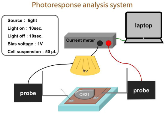Scheme of the experimental setup used for the photoresponse characterization system. Cells suspension is directly dripped onto 2 × 2 cm2 biosensor without any immobilization.
