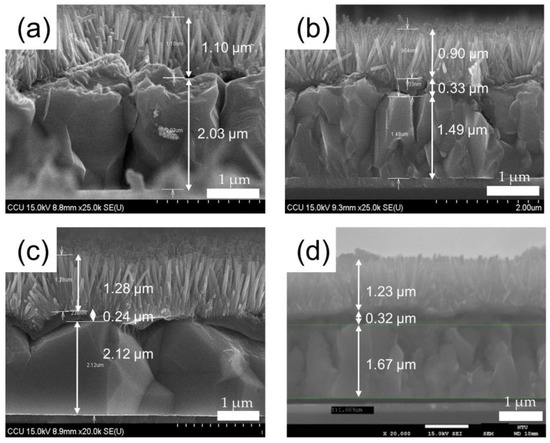 Figure 3 shows the side-view SEM images of the Cu2O/ZnO NR heterostructures prepared by three different electrolytes, namely, 0.4 M CuSO4 for 30 min (Figure 3a,b), 0.4 M CuSO4 with 0.4M HMTA for 30 min (Figure 3c), and 0.4 M CuSO4 for 25 min + 0.4 M CuSO4 with 0.4 M HMTA for 5 min (Figure 3d). As the deposition time of Cu2O remains the same across the four samples, the thicknesses of the four samples are all approximately 2 μm. Owing to Cu2O being the main absorption layer of a biosensor [35], film thickness should be controlled to about 2 μm to avoid material defects that could hinder light absorption and charge carrier transmission. Figure 3c,d shows that the addition of HMTA to the electrolyte facilitates Cu2O crystallization relative to the case of the electrolyte without HMTA (Figure 3a,b). In addition, as the deposition time of the electrolyte with HMTA increases, highly crystallized Cu2O structures are formed, as shown in Figure 3c. As HMTA is responsible for controlling the growth rate of crystals, Cu2O crystals would not grow fragmented. By contrast, the addition of PEDOT:PSS (200–300 nm) improves the smoothness of the Cu2O surface, thus causing the verticality of ZnO NRs and increasing the quality of the interface with Cu2O [36].