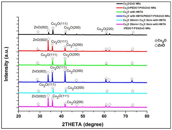 XRD patterns of samples based on Cu2O/ZnO and Cu2O/PEDOT:PSS/ZnO heterostructure. With the help of HMTA and PEDOT:PSS, the signal in the preferred direction, (111) of Cu2O and (002) of ZnO, becomes stronger.