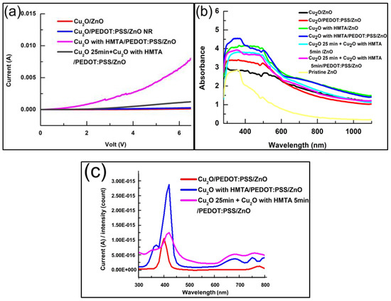 The electrical properties of the four samples in the depositional environment with different electrolytes are illustrated by the I–V measurement, as shown in Figure 5a. Figure 5a shows that the sample of Cu2O with HMTA/PEDOT:PSS/ZnO has the best electric performance, which agrees with the XRD result. High electrical performance is obtained as the deposition time of CuSO4 with HMTA electrolyte increases. As adopting HMTA can manipulate the vertical growth rate of Cu2O, its growth on the lattice plane in the (111) direction is prioritized, and the electrical performance of the sample improves more obviously than that of the sample without HMTA. The addition of PEDOT:PSS also increases the electrical properties by reducing the defects in the interface of Cu2O and ZnO and enhancing the signal intensity in the (200) direction of Cu2O. Figure 5b shows that the sample with Cu2O/PEDOT:PSS/ZnO has a higher absorption in 300–500 nm than the sample with Cu2O/ZnO. The comparison of the Cu2O/PEDOT:PSS/ZnO and Cu2O with HMTA/PEDOT:PSS/ZnO samples in Figure 5b indicates that HMTA can increase the absorption in 300–500 nm. In other words, HMTA and PEDOT:PSS enhances the absorption of devices between 300 and 500 nm. Thus, when we adopt HMTA and PEDOT:PSS for devices simultaneously, we can achieve strong light absorption between 300 and 400 nm, which helps reveal the absorption characteristics of ZnO. Figure 5c illustrates that the Cu2O/PEDOT:PSS/ZnO biosensor has a maximum photocurrent of approximately 400 nm, which is due to ZnO. However, the absorption of ZnO decreases abruptly above the 400 nm wavelength, as shown in Figure 5b, and corresponds to the descending slope of the photocurrent gradually increasing between the 400 and 450 nm wavelengths in Figure 5c. By contrast, Cu2O with HMTA film can considerably enhance the photocurrent between 350 and 450 nm. Overall, the spectral response of the photocurrent, as shown in Figure 5c, matches the absorption spectrum, as shown in Figure 5b.