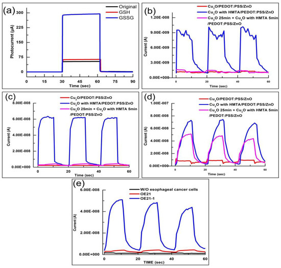 In this study, we utilize two characteristic substances, namely, Glutathione (GSH) and Glutathione disulfide (GSSG), to verify the detection mechanism of the developed biosensor. In general, GSH in cells exists in two forms: 90% of GSH exists in the form of reduced GSH in the cytoplasm, and 10% of GSH exists in the mitochondria. For healthy cells, the ratio of GSH to GSSG is greater than 10:1; however, when the cells become cancerous, the ratio of GSH to GSSG decreases [38,39]. In other words, the concentration of GSSG increases and GSH decreases because the oxidative stress in cancer cells is much higher than that in healthy cells, leading to an imbalance in the redox ratio [40]. Therefore, when cancer cells with a high concentration of GSSG resulting from the imbalance in the redox ration are detected by using a biosensor, the biosensor obtains a gain in the photocurrent. We verify the switching characteristics of 100 μM GSSG in phosphate-buffered saline (PBS) solution, 100 μM GSSG in PBS solution, and pure PBS solution in 500 µL based on Cu2O/PEDOT:PSS/ZnO structure, as shown in Figure 6a. The GSSG solution has a high gain effect on the photocurrent because GSSG is in the oxidation state, which can be reduced by electrons. This mechanism shows how the biosensor works in this study. Thus, GSSG can increase the photocurrent in electron transport. Meanwhile, GSH is in a reduced state and is thus insensitive to the proposed biosensor. Thus, its photocurrent only slightly increases relative to that of the pure PBS solution.