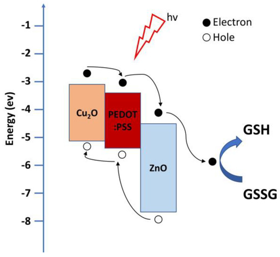 Illustration of the photoelectrochemical (PEC) mechanism for GSSG detection by a biosensor based on Cu2O/PEDOT:PSS/ZnO stepwise energy-level heterostructure.