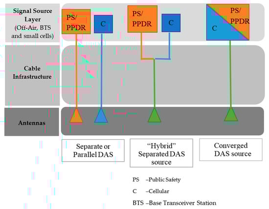 The evolution of mobile wireless communication systems has shifted its focus from voice to mobile broadband applications that seamlessly support high data streaming, high quality of experience, ultra-low latency and high throughput anywhere and anytime. The statistics from the industry present that nearly 80% of all mobile usage or traffic happening inside buildings [,]. Therefore, the distributed antenna system (DAS) has been regarded as an essential solution to meet the rising demand for indoor coverage and capacity. Recently, efforts have been taking place to include the public safety (PS) or protection and disaster relief (PPDR) telecommunication systems in the long term evolution (LTE) DAS network. Therefore, DAS networks need to support PS/PPDR bands such as very high frequency (VHF) and ultra-high frequency (UHF—including 380, 700 and 800 MHz bands). Figure 1 illustrates the three enabling DAS approaches for commercial cellular and PS/PPDR indoor coverage.
