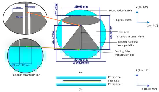 Firstly, the required size of the antenna design based on the concepts from [,,] was studied to meet the lowest frequency of 350 MHz through simulation with CST Microwave studio. Figure 2 illustrates an elliptical monopole antenna with a trapezoid ground plane and tapering transmission line. We resized the antenna design to about 264 × 233.76 mm on a AD300 C substrate (Ɛr = 2.97 and tanδ = 0.0020 at 10 GHz) to meet the lowest frequency down to 350 MHz. This translates that the minimum diameter of a disc-shaped radome is about 342.9 mm (0.5 λfl) without modification. However, this diameter is large. The material used for radome is polycarbonate (PC) with dielectric constant, Ɛr = 2.9.