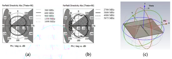 The simulated azimuth radiation pattern (Theta = 90° plane) of the elliptical monopole with trapezoid ground plane lied at the horizontal plane for the frequency range of (a) 350–1690 MHz and (b) 2700–5875 MHz. (c) The coordinate system of the model.