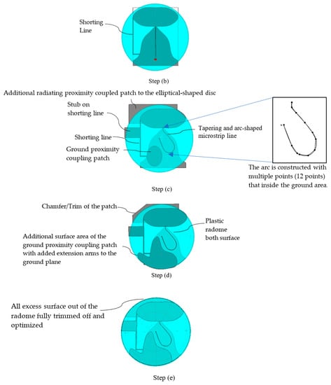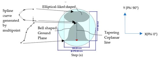Figure 5 illustrates the modifications in evolution steps to fit the radiating element into a small disc-shaped radome in about 270 mm dia. Step (a) exhibits the construction of an elliptical-liked shape with multiple splines points instead of the typical curve construction of the x-diameter and y-diameter of elliptical shape. The additional spline curve points allow more freedom to tweak the curvature of the structure, especially those points close to the center between the disc and ground plane for better wideband matching. A few spline points with a bell-shaped structure constructs the ground plane of the antenna instead of the typical trapezoid-shaped ground plane. The transmission line remains as a tapering coplanar line. The inward edge between the ground plane and the elliptical radiating element is essential to ensure a good impedance match over a wide range of frequency. The whole radiating element is confined within the size of 212 × 180 mm by noting that the upper corner area of the rectangle remains unused due to the elliptically shaped radiating element. With this size, the antenna is matched at the lowest frequency of 710 MHz, as shown in Figure 6.