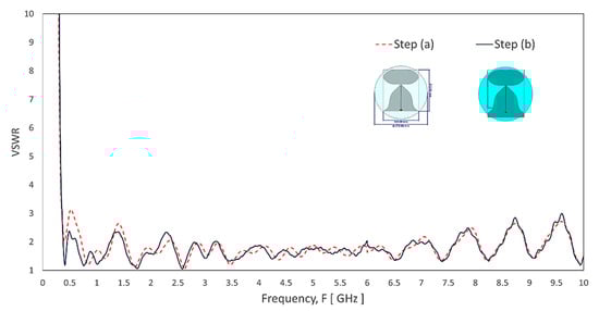 The simulated VSWR of the evolution steps from Figure 5: Step (a) and Step (b).
