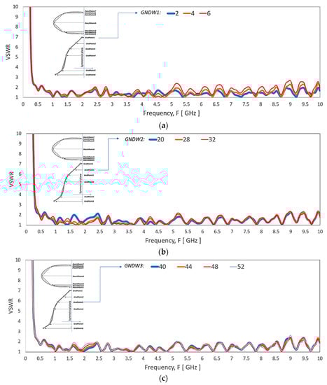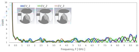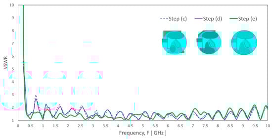 Figure 7. The simulated VSWR of the evolution steps from Figure 5: Step (c) to Step (e).