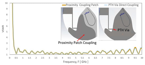 The simulated VSWR between using proximity coupling patch and PTH via direct coupling at the end of the shorting line to the ground plane.