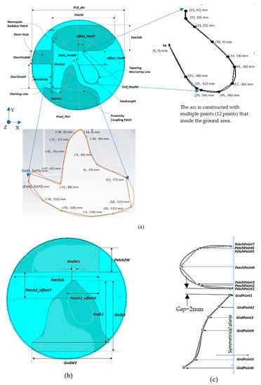Figure 10a,b show the internal PCB of the antenna with the top and bottom layers, respectively in a translucent radome. The PCB substrate uses AD300 C (dielectric constant, Ɛr = 2.97, and tangent loss, tan δ = 0.002 at 10 GHz) from Rogers Corp. (Chandler, Arizona, USA). The top layer consists of a microstrip line, an elliptical-liked shape radiating patch, a ground proximity coupling patch, a shorting line, and stub arm at the shorting line. The microstrip line width is tapering with the starting width of Start_FeedW, and End_FeedW that curls from the center of the antenna to the offset feeding point (Offset_FeedX, Offset_FeedY). The monopole elliptical-liked radiator patch has PatchL and PatchW that constructed by the multiple spline points, as shown in Figure 10c. Also, the figure shows the spline points that build the bell-shaped ground plane for the bottom layer. The spline points are defined as PatchPoint1 to PatchPoint7 for the patch, and GndPoint1 to GndPoint6 are the spline points for the ground plane. The total length of the shorting line includes ShortL1 and ShortL2. A stub arm at the shorting line located at ShortstubP with the width and length defined as ShortStubW and ShortStubL, respectively. A radiating proximity coupling patch positioned at (Patch2offsetX, Patch2offsetY) is with the width and length of the patch set as Patch2W and Patch2L. The formable RG402 coaxial cable feeds the center of the board with its braid soldered to the ground plane at the bottom layer and its center core soldered at the top layer that feeds the microstrip line. Table 4 summarized the proposed design parameters.
