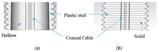 The plastic stud (a) with a hollow structure and (b) with solid ribs to hold the coaxial cable tightly.