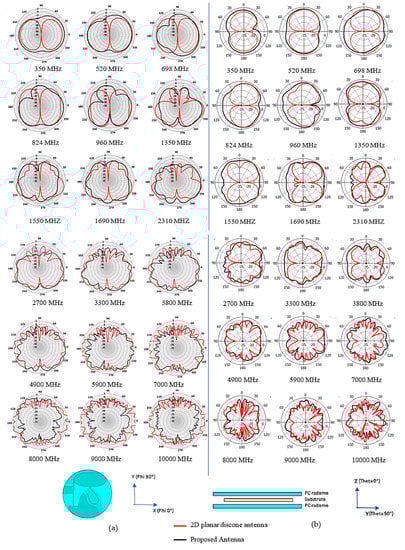 Comparison of the simulated radiation pattern of the conventional 2D planar discone antenna and the proposed antenna at (a) Azimuth Plane (X-Y Plane) and (b) Elevation 90° Plane (Y-Z Plane).
