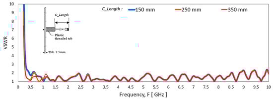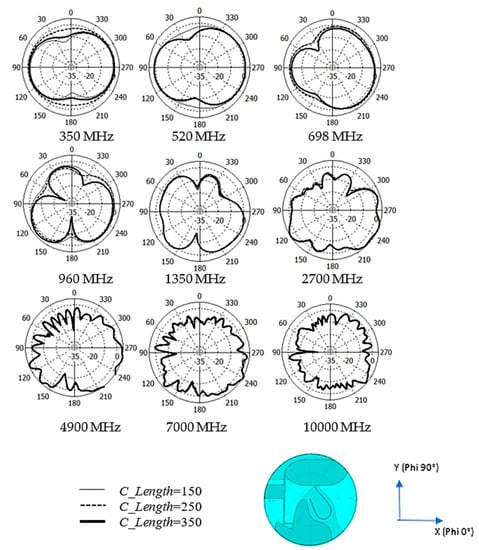 As noted, the unbalanced cable effect will lead to some variance of performance of different pigtail cable length, C_length. Therefore, the exact cable length model in the simulation tool offers a more accurate comparison result of the antenna measurement. A few antenna cable lengths, C_length are simulated to investigate their impact on the VSWR and radiation pattern of the antenna. Figure 13 shows simulated VSWR with a varying cable length of the antenna. The simulated result shows a more significant impact at the frequency range of 350–760 MHz for the varying C_length. The effect of the cable length at the frequency range of 760 to 10,000 MHz is minimal. If the simulation model is with different length, there will be a large discrepancy in the simulated and measured results as a referenced result.