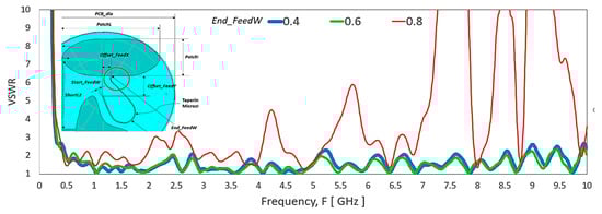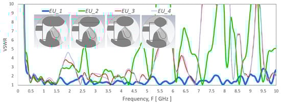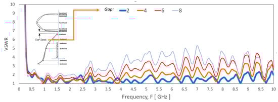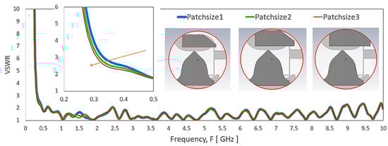 - Also, by introducing a stub along the shorting line, the VSWR improves at the lowest frequency range, where it covers a broader band 342 MHz–642 MHz, as shown in Figure 7.