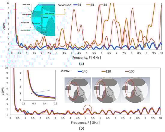 VSWR of the antenna by varying the (a) stub location, ShortStubP at the shorting between the monopole patch and the proximity ground coupling patch, and (b) shorting path length, ShortL2.