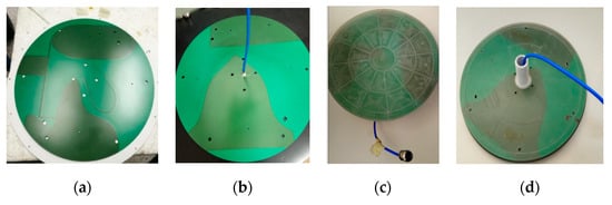 The photo of PCB with green mask (a) Top View and (b) Back View. The picture of the prototype with a transparent radome and cable assembly (c) Top View and (d) Back View.