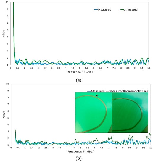 (a) Comparison of the simulated and measured VSWR of the antenna. (b) The measured VSWR of the antenna with the segmented edge and smooth edge microstrip line.
