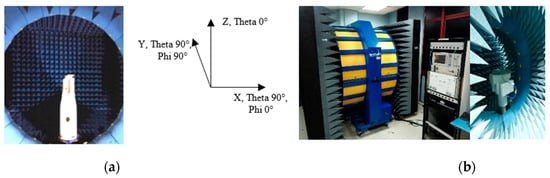 Measurement setup in (a) Satimo SG24 (350–6000 MHz measurement) and (b) Satimo Starlab (7000–10,000 MHz) for the radiation pattern measurement of the antenna.