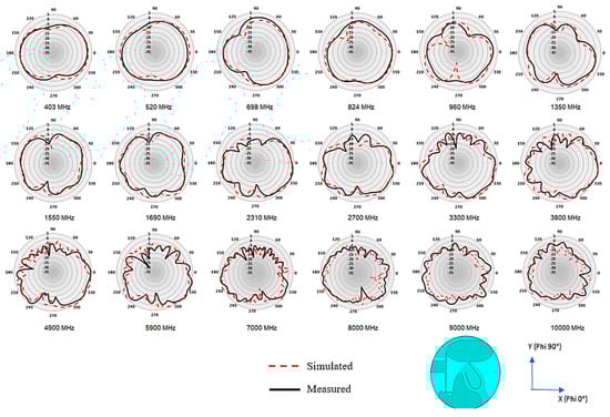 Simulated and measured azimuth (theta 90°/ X-Y) plane radiation pattern of the proposed antenna from 350 MHz to 10,000 MHz.