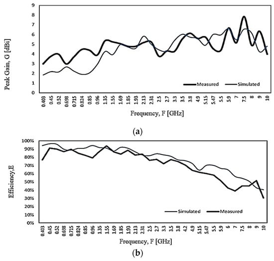 Figure 27a shows a comparison between measured and simulated antenna peak gain within the operating frequency range. The simulation gain result from 600 MHz onwards conforms well with the measurement result. It has a higher measured gain at the 350 MHz band. The discrepancy can be the result of the higher uncertainty of the measurement chamber SG 24, which is more suitable for the measurement above 400 MHz and ripple of the radiation pattern caused by unbalanced cable effect. Figure 27b shows a comparison between the measured and simulated efficiency of the proposed antenna. Both measured and simulated results correlated to each other with minimal variation. The trend of the total efficiency shows the efficiency drop with the frequency, from about 85–90% at the UHF band to about 30% at 10 GHz.