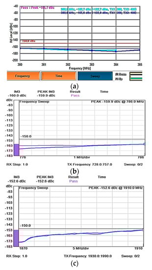 Figure 29 shows the measured PIM level of the three-representative frequency range (380 MHz-band, 700 MHz-band, and 1920 MHz-band). The measured peak PIM level is −165.7 dBc, −159.9 dBc, and −152.6 dBc for 380 MHz-band, 700 MHz-band, and 1920 MHz-band, respectively.