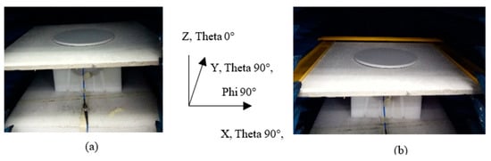 The application of the proposed antenna limits to mount on the (mineral and fiber)-filled acoustic ceiling due to its asymmetrical dipole characteristics. It will have a significant detuning effect if to install on any metal ceiling or metal-backed ceiling. Typical 600 mm × 1200 mm × 15 mm ceiling tile size is too large for the available measurement chamber; therefore, only a half size (600 mm × 600 mm × 15 mm standard acoustic tile) is used to verify its effect to antenna performance. Other than the ceiling tile material effect, three sides of the edge metal frame that represent half of the typical tile installation was measured as well. Figure 30 shows a photo of the antenna taken with the acoustic tiles with or without the frame.