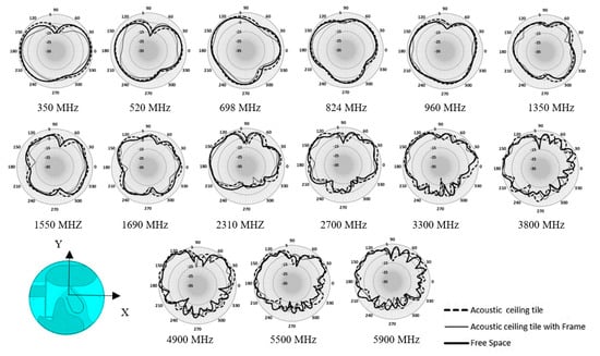Ceiling tiles and frame effect to the antenna measured azimuth plane (X-Y plane) radiation pattern.