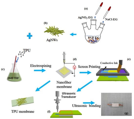 Fabrication schematics for the nanofiber membrane based flexible capacitive pressure sensor: (a,b) preparation of silver nanowires (AgNWs), (c) preparation of spinning solution, (d) electrospinning process, (e–g) assembly of sensors: electrode printing and ultrasonic welding.