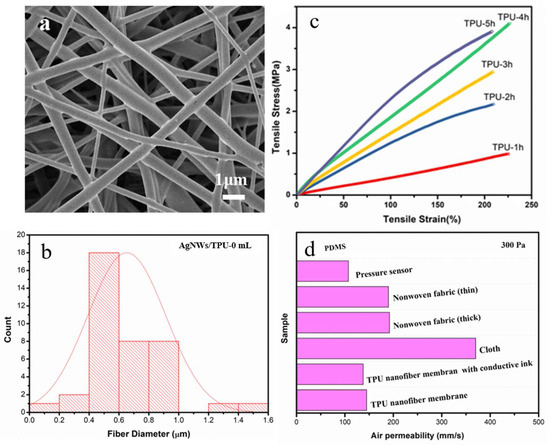 TPU ENMs and AgNW/TPU ENMs were studied in terms of their morphology, composition, breathability, and mechanical properties to understand and evaluate the synergistic effects of nanofibrous microstructures and AgNW doping on the sensing performance of the TPU nanofiber based flexible capacitive pressure sensor. The morphology of the TPU ENMs with different spinning times are shown in Figure S1 (Supplementary Materials). As shown in Figure 2a,b, as the fiber diameter was uniform and the average diameter was 652 ± 5.0 nm. Additionally, there were no spindles or breakages in the TPU-3 h ENMs, which is beneficial to the flexibility and reproducibility of sensor.