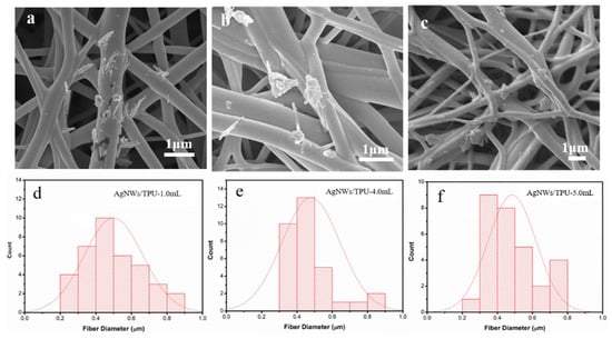 SEM images and fiber diameter distributions of AgNW/TPU composite nanofiber membranes with different AgNW doping amounts: (a,d) AgNW/TPU-1.0 mL; (b,e) AgNW/TPU-4.0 mL; (c,f) AgNW/TPU-5.0 mL.