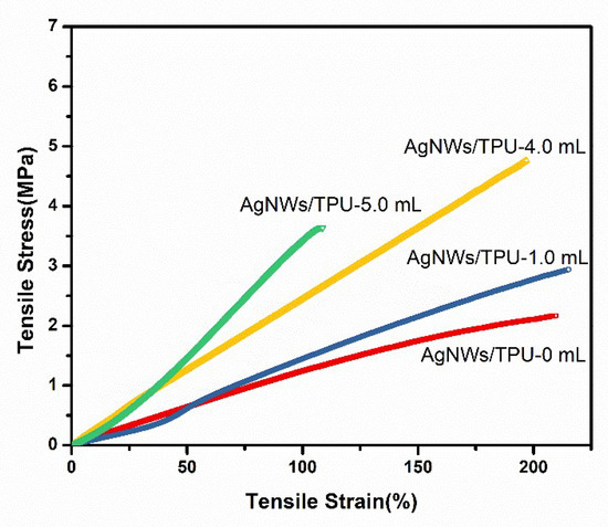 Stress–strain curves of AgNW/TPU ENMs with different AgNWs doping amounts.