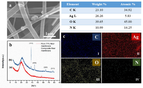 Furthermore, aiming to prove the existence of AgNWs in a TPU nanofiber membrane, AgNW/TPU-4.0 mL was characterized by energy-dispersive spectroscopy (EDS) and X-ray diffraction (XRD). In Figure 5, EDS mapping analysis reveals the coexistence of C, O, N, and Ag in the sample, and it can be seen that relative concentration of each individual element was about 23.10, 26.26, 45.00, and 14.25 wt%, respectively. Figure 5 shows the XRD patterns of the pure TPU nanofiber membrane and AgNW/TPU-4.0 mL composite nanofiber membrane. From the curve (a), there was only a wide diffraction peak around 2θ = 20° and absence of any other sharp diffraction peak, showing that there was no crystal in the irradiation process of TPU, and that it only had a locally organized structure. In the XRD pattern of the composite nanofiber membrane (curve b), it also displayed the wide diffraction peak of TPU around 20° with similar shape. Besides that, the diffraction peak at 2θ = 37.95°, 44.19°, 64.39°, and 77.24° corresponded to the characterized diffraction peaks of (111), (200), (220), and (311) for silver (JCPD NO. 99-0094), respectively [41,42,43,44].