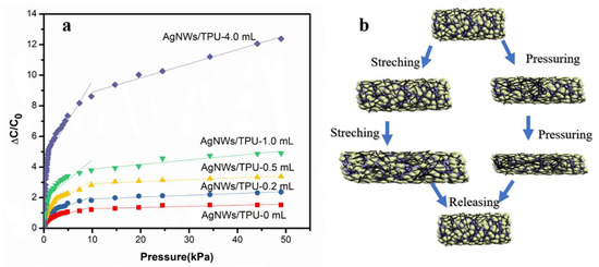 In order to further improve the sensitivity of the nanofiber based capacitive pressure sensor, AgNWs were added into the polymer for controlling the permittivity of the dielectric layer. Considering the sensitivity and tensile property of the TPU nanofiber membrane, we chose the nanofiber membrane with a spinning time of three hours to prepare the composite dielectric layer. Figure 6a illustrates the sensitivity of the pressure sensor constructed by the TPU-3 h ENMs as the support layer and AgNW/TPU ENMs as the composite dielectric layer. The sensitivities of the sensors were calculated based on Equation (3) and listed in Table 1. It is obvious that the sensitivities of the sensors increased with an increase in the AgNW doping amount and decreased with increasing external pressure. When the addition of AgNWs was 4.0 mL, Sstage1 was higher than four times the undoped sample (i.e., as high as 7.24 kPa−1). The Sstage1 (7.24 kPa−1) was higher than the sensor (3.73 kPa−1) that Cheng et al. reported [45], which was assembled by hierarchically microstructured Pt/Pyramidal PDMS and Pt/BOPP (biaxially oriented polypropylene) electrodes. In contrast, our sensor achieved an ultrahigh sensitivity in a relatively lower and wider pressure range (7.24 kPa−1 at 9.0 × 10−3 ~ 0.98 kPa). In spite of this, our sensor still exhibited a high sensitivity of 0.15 kPa−1 at a large pressure of 49 kPa.