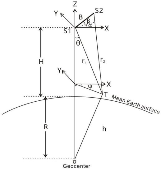 In Figure 1, and represent the locations of radar antennas, represents the height of point above the mean earth surface, is the radius of the earth, and represents distance between point and the geocentric point, denoted as . At point , a Cartesian coordinate system is established, where the -axis points to the range direction and -axis points to the azimuth direction. The -axis points to the direction from geocentric point to point . is the baseline; , are respectively, azimuth angle and pitch angle of the baseline. Moreover, is the incidence angle, is the azimuth angle of the target and is also the dihedral angle between and . is the slant distance between antenna position and target position . is the slant distance between position of antenna and target . Hence, the coordinates of , , and are , and , respectively. Thus, the relationship between and can be derived as: