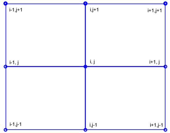 The height accuracy is the basis for discussion in gravity field product accuracy. For convenience, we define two kinds of height accuracy, i.e., absolute accuracy and relative accuracy. In this study, the relative height is the average elevation difference between a simulated elevation point and its four adjacent points. The relative height accuracy is evaluated by the relative height differences between the results with and without radar interferometer parameter errors, denoted as . The absolute elevation errors refer to the elevation differences between simulated sea level elevation points without InRA errors and corresponding elevation points with InRA errors, denoted as . In order to derive the formulas for computing (see Equation (13)) and (see Equation (14)), the points distribution is given in Figure 2.