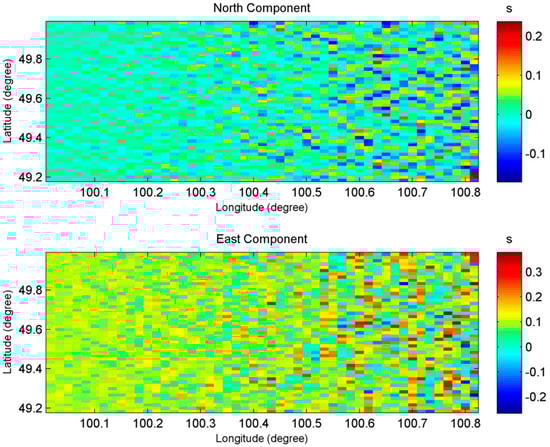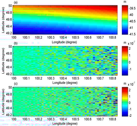 The satellite is designed to fly from south to north. Hence, the range direction is from the west to the east and the azimuth direction is from the south to the north. The former EGM2008 up to degree/order (d/o) 2–200 [17] was used to simulate geoid (denoted as ), gravity anomaly and vertical deflection data at a resolution of 1′ × 1′ in an area with latitude ranging from 49.17°~50° and longitude ranging from 100°~100.83°. The geoid, gravity anomaly and vertical deflections data simulated by EGM2008 are used as the true values. Since the aim of this paper is to discuss the influence of InRA errors on gravity field recovery, geoid values are used as sea surface heights directly although mean dynamic topography also influence the accuracy of gravity field inversion. Based on Equations (3)–(4), and are firstly derived using , , , , and . These values are seen as InRA observations. In the second step, new geoid data denoted as , can be derived using InRA observations and InRA parameters. In this step, InRA errors such as errors of , , , , , and are added, which results in errors in the newly derived geoid data and the finally inverted gravity field. It needs to be noted that environmental influences [5,36], such as atmospheric effects, also influence the accuracy of gravity field detection. However, if all these factors are considered, it would be difficult to distinguish which errors originate from the InRA system and which errors originate from environment corrections. Hence, in this study, the environmental influences are not considered and will be investigated in future studies. Obviously, if no errors are added, should be equal to . However, due to the computational errors, there are minor differences between and (see Figure 3). In Figure 3, most of the errors are smaller than 10−7 m. Thus, was used to compute vertical deflections, which were compared with the assumed true values computed directly from EGM2008. The related statistics of their differences are shown in Table 2, which outlines the reliability of the method for computing vertical deflections in this study.