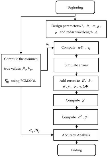 In order to analyze the influences of , , , , , , and on the inversion of vertical deflections and gravity anomalies, noise (Table 3) is added to the interferometric system, which is similar in design to the SWOT mission, and geoid data are obtained. Vertical deflections are then computed using Equation (16). By comparison with the assumed true values (from EGM2008 directly), one can evaluate the effects of different magnitudes of the InRA parameter errors on vertical deflections and gravity anomaly inversion. It needs to be noted that what is of interest in computing gravity filed products is relative heights. According to Jin et al. [40], and González and Bräutigam [32], apart from interferometric phase errors, other InRA errors can be seen as systematic errors in a small area. Hence, apart from interferometric phase errors, the errors shown in Table 3 are the same for computing vertical deflections in a small area. The interferometric phase errors are added as white noise with standard deviation as given in Table 3. A schematic view of the computational process is shown in Figure 4.