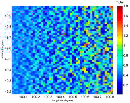 In order to analyze the error distribution in space domain, as an example, Table 9 gives the accuracy statistics of gravity anomalies when phase error is 0.5 mrad and the error distribution in space is shown in Figure 6 and Figure 7.